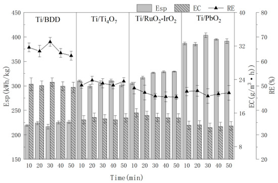 The selection of anode materials is the key point of EAOPs. Anode materials as a working electrode are the core of electrochemical oxidation processes in the current efficiency of anodic oxidation and RE [24]. For the evaluation of anode material, the effects of the anode material on the RE, EC and Esp of MCB waste gas by electrochemical oxidation are shown in Figure 2. In this study, BDD, Ti/PbO2, Ti/Ti4O7 and Ti/RuO2-IrO2 were selected as anode materials, and the titanium plate as the cathode, under the processing conditions of 0.10 mol/L NaCl solution, 10.0 mA/cm2 current density and 4.0 cm electrode distance. As shown in Figure 2, the RE, EC and Esp exhibited little trend for treating MCB under four different anode materials. The RE of Ti/BDD anode was the highest, followed by Ti/Ti4O7, Ti/RuO2-IrO2 and Ti/PbO2, while the EC and Esp of the Ti/Ti4O7 anode were significantly better than for Ti/RuO2-IrO2 and Ti/PbO2. The BDD electrode has a high oxygen evolution potential and high catalytic activity. In the reactions, a large number of hydroxyl radicals, peroxides, ozone and other strong oxidizing substances were generated, which can effectively degrade organic pollutants [25]. However, BDD electrodes have the disadvantage of high cost, which limits the application range in treating pollutants and needs to be further improved. Traditional electrode materials exhibit several limitations, such as a short service life, poor removal effect and high cost, including graphite electrodes, metal electrodes and dimensionally stable anodes [26]. As a new electrode material, Ti/Ti4O7 has been widely regarded as a promising electrode material for electrochemical applications [27]. Ti/Ti4O7 has advantages such as a 15.0 s/cm conductivity, a potential for oxygen evolution up to 3.0 V, electrical conductivity up to 15.0 s/cm and a wide potential window [28]. Meanwhile, Ti/Ti4O7 resists strong acid and alkali corrosion, and has stable chemical properties and a lower cost [27]. In conclusion, considering cost, RE and Esp, Ti/Ti4O7 was selected as the next anode material to save energy and green development. The RE, EC and Esp reached 50.21%~51.87%, 27.26 g/(m3·h) and 305.27 (kW·h)/kg in 10.0~50.0 min.
