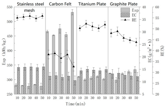 Cathodes are an important component during electrochemical oxidation reaction for hydrogen evolution reaction occurs. Few secondary reaction occurred in higher hydrogen evolution potential, and for the reduction reaction of cathodes have low contribution to treat pollutants. For these reasons, most studies have paid less attention to optimizing the cathode. But, the cathode reduces the oxygen produced by the anode to H2O2, which produces ·OH and improves the treatment effect. Thus, in order to systematically study cathode materials’ effect on the RE, EC and Esp of MCB gas, titanium plate, graphite plate, stainless steel mesh and carbon felt were used. The other parameters of electrochemical oxidation were Ti/Ti4O7 as the anode, 0.10 mol/L NaCl, 10.0 mA/cm2 current density, 4.0 cm electrode distance and electrolysis for 10.0–50.0 min. The experimental results are shown in Figure 3.