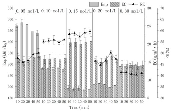 The influence of NaCl electrolyte concentration (0.05, 0.10, 0.15, 0.20 and 0.30 mol/L) on the RE, EC and Esp of MCB gas were investigated, when Ti/Ti4O7 was used as the anode, stainless steel mesh as the cathode, 10.0 mA/cm2 current density and 4.0 cm electrode distance for 10.0–50.0 min of electrolysis. The results are shown in Figure 4; lower or higher electrolyte concentrations also have a great influence on the removal effect. When the electrolyte concentration was 0.15 mol/L, the best RE was achieved and the average RE and EC were 58.55% and 20.39 g/(m3·h), respectively. Meanwhile, the lowest Esp was 188.47 (kW·h)/kg. When 0.30 mol/L NaCl was used, the treatment effect was the worst. The reason is that when the electrolyte concentration is high, the interaction force between ions increases, causing a decrease in the ion movement rate and reaction rate [31]. At the same time, a large amount of Cl− ions are absorbed on the electrode surface, which hinders the production of ·OH [31]. In order to save energy, a 0.15 mol/L NaCl electrolyte concentration was selected for the next experiment.