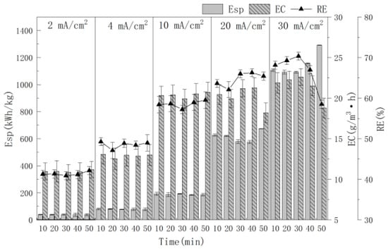 Current density is an important operating parameter during electrochemical oxidation for the evaluation of the Esp and RE of MCB. Figure 5 showed the influence of the current density (2.0, 4.0, 10.0, 20.0, 30.0 mA/cm2) on the treatment efficiency. In this study, the anode material, cathode material, electrode distance and electrolyte concentration were Ti/Ti4O7, stainless steel net, 4.0 cm and 0.15 mol/L NaCl, respectively. It can be seen that the RE, EC and Esp increase with increasing current density. When the current density was 2.0, 4.0, 10.0, 20.0 and 30.0 mA/cm2, the corresponding average RE was 41.36, 48.53, 58.54, 64.69 and 66.65%, respectively. The reason is that the anode produces more ·OH with an increasing current density, which increases the electron transfer speed in the electrolyte and promotes chemical reactions in the solution, leading to RE increasing. But a higher current density causes a voltage increase and Esp increase. Especially, the average Esp of the 20.0 mA/cm2 and 30.0 mA/cm2 current density increases to 615.08 (kW·h)/kg and 1147.73 (kW·h)/kg, respectively, which is much higher than 188.55 (kW·h)/kg when the current density is 10.0 mA/cm2.
