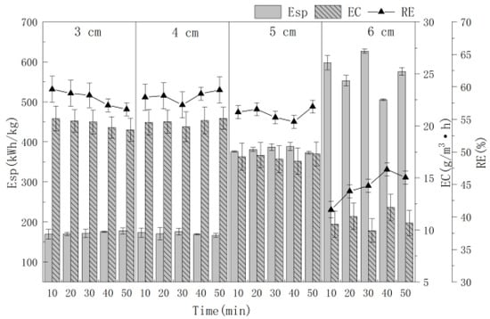 When the electrode distance is 3.0, 4.0 and 5.0 cm, the average Esp is about 172.79, 171.03 and 381.02 (Kw·h)/kg. It can be seen that when the electrode distance is 4.0 cm, RE, EC and Esp are the best, so 4.0 cm was chosen as the best electrode distance.