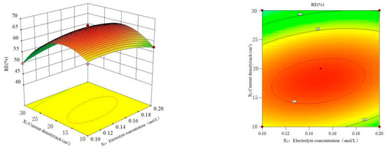 The data in Table 2 were studied by dimension reduction to analyze the interaction effects of the electrolyte concentration, current density and electrode distance on the RE. The response surface and contour diagram are shown in Figure 7, Figure 8 and Figure 9.