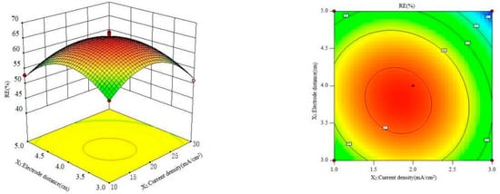 Figure 9 shows the influence of current density and electrode distance on the RE at a constant electrolyte concentration. It can be seen from Figure 9 that the contour diagram has a wide longitudinal span and shows an obvious oval shape. The greatest RE was achieved at a 15.0–20.0 mA/cm2 current density and 3.5–4.0 cm electrode distance.