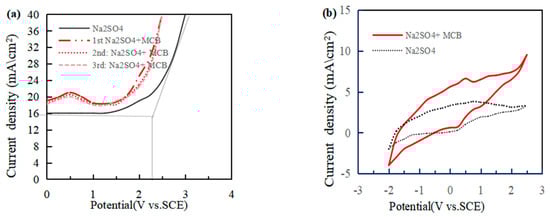 LSV (a) and CV (b) curves in Na2 SO4 solution and MCB solution by the Ti /Ti4O7 anode.