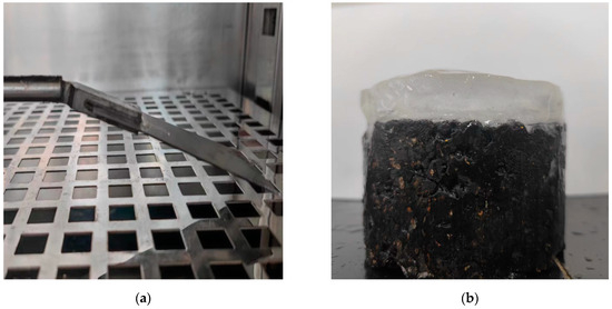 To simulate the freezing and low-temperature environment in winter, the test specimens (Marshall specimens) were first pre-frozen in a low-temperature environment for 15 h, simulating the winter road surface. To control the ice-covered layer to reach a quantitative area, the Marshall specimen was wrapped with tin foil to create a cylindrical water tank and sealed to prevent water from flowing out. Subsequently, the water was dripped on the surface of the test specimen until the thickness of the ice layer reached 2 cm. The specimens were frozen for 5 h at −10 °C until the ice layer was completely condensed on the surface.