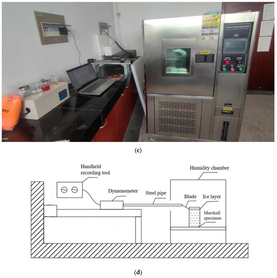 Evaluation method for adhesion force: (a) blade; (b) iced Marshall specimen; and (c) temperature humidity test chamber; (d) experiment instrument.