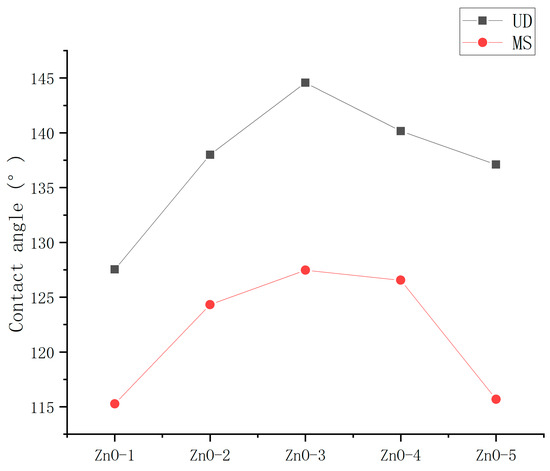 Contact angles of ZnO hydrophobic materials dispersed using MS and UD.