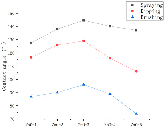 Contact angles of ZnO hydrophobic materials applied by spraying, dipping, and brushing methods.