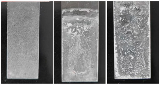 What needs clarification is the coating testing performed on asphalt concrete, and Figure 9 shows more clearly the difference in coating morphology. As shown in Figure 9, the coating prepared by the spraying method was even, it had a consistent thickness, and its surface was a milky white film. Moreover, the contact angle data at each position had small discreteness, indicating that its hydrophobicity was uniform. The coating prepared using the dipping method was uneven; the nanomaterials were more concentrated in the middle part. Further, some materials agglomerated to form milky white bumps, which was not conducive to the hydrophobicity of the coating. In addition, some areas were not available for contact angle measurement, and the contact angle data at each position had large discreteness. The surface of the coating prepared by the brushing method was uneven and had many milky white protrusions; in particular, the material aggregated more at the edges. Moreover, the overall coating was thick, and most areas were unavailable for contact angle measurement.