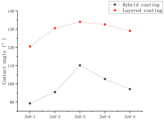 To determine the optimum introduction method for epoxy resin, the contact angles of the ZnO/epoxy hybrid coating and ZnO/epoxy layered coating were measured. The ultrasonic dispersion (UD) instrument method was used for dispersion. The spraying method was used for application.