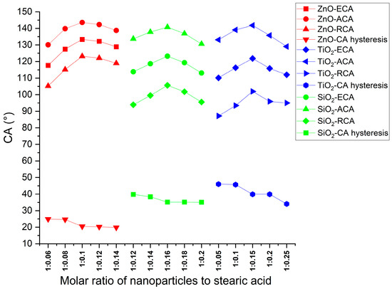 It was found that the peak areas of TiO2 and SiO2 were significantly smaller than that of ZnO, indicating that the reaction degree of TiO2 and SiO2 with stearic acid was significantly lower than that of ZnO. This could explain the lower hydrophobicity of the TiO2 and SiO2 coatings.