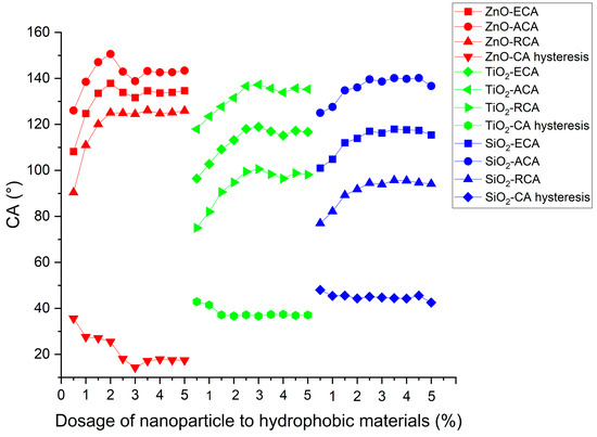 - The mass ratio of nanoparticles to stearic acid and dosage of nanoparticle to hydrophobic materials have a significant impact on the contact angle of the hydrophobic coating. If the amount of stearic acid was more than the optimum value, the hydrophilic carboxyl group in the unreacted stearic acid and the hydrophobic interactions of stearic acid reduced the hydrophilicity of the coating. In addition, as the nanoparticle content increases, the aggregation of nano-particles becomes more serious, which makes the dispersion of nanoparticles more difficult and the hydrophobicity growth rate of the coating worse.