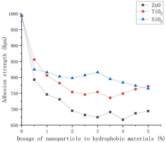 The adhesion strength between the ice and coating under different nanoparticle dosages was tested. The results are shown in Figure 15.