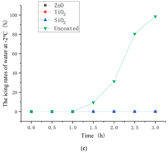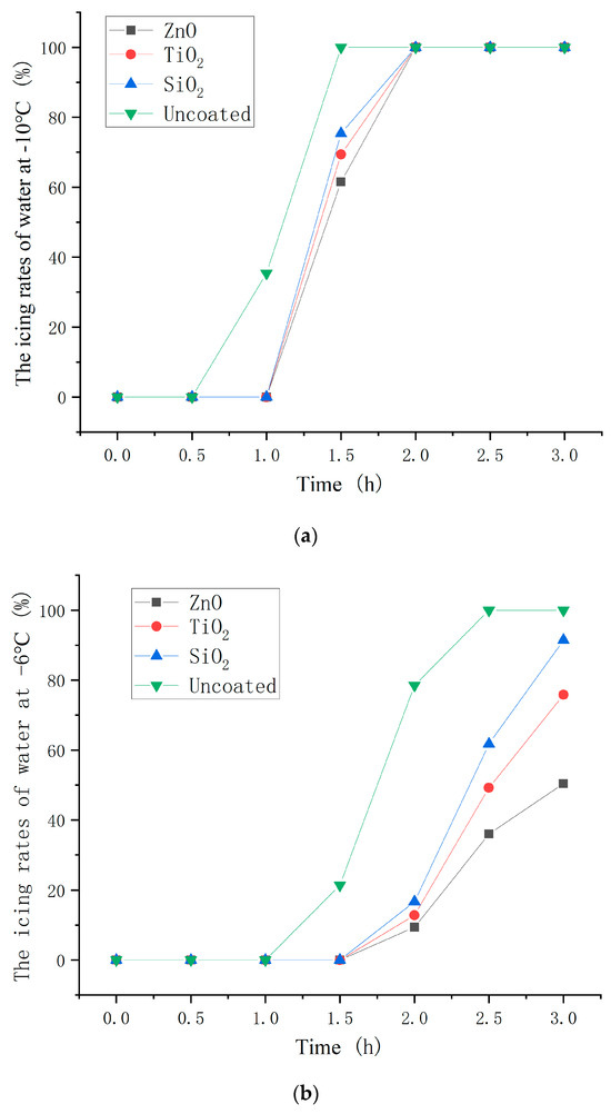 As shown in Figure 16, the beginning icing time of coated asphalt concrete was significantly later than that of uncoated asphalt concrete and the icing proportion of coated asphalt concrete was less than that of uncoated asphalt concrete at the same point in time. This indicates that the hydrophobic coating has a good inhibiting effect on icing. Moreover, the inhibiting effect on icing of the ZnO, TiO2, and SiO2 hydrophobic coatings decreased in turn. In the environmental contexts characterized by temperatures of −10 °C and −2 °C, the hydrophobic coating demonstrated a notable extension of the initiation time of ice formation, ranging from a substantial 30 min to a considerable minimum of 2 h, respectively. This signifies the potential of hydrophobic coatings to effectively delay the onset of ice formation, thereby mitigating ice accumulation on road surfaces and, consequently, affording additional time for de-icing procedures.