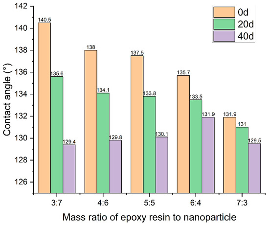 The contact angle of the hydrophobic coatings remained significantly higher than that of pure epoxy resin even after 40 days. This observation indicates that the nanoparticles retained their hydrophobic properties and continued to contribute to the coatings’ hydrophobicity over time.