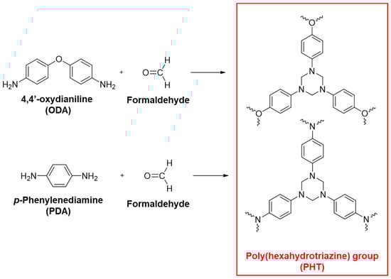 Research has been conducted on vitrimers used as high thermal conductivity nanocomposites, specifically focusing on composites involving the chemical bonding of 1,3,5-triazine. Within the 1,3,5-triazine chemical group, attention has been directed towards substances from the poly(hexahydrotriazine) (PHT) series. PHT, initially reported by IBM in 2014, is synthesized through the polycondensation of 4,4′-oxydianiline or p-phenylenediamine with paraformaldehyde (as shown in Figure 3), showcasing exceptional mechanical properties and mechanical strength, resulting from a high crosslink density [,].