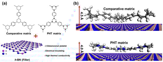 In this review, a nanocomposite is fabricated by utilizing PHT synthesized by p-phenylenediamine with paraformaldehyde with vitrimer properties, and hexagonal boron-nitride (h-BN) is chosen as the filler due to its advantageous plate-like structure, proving superior to spherical fillers []. The interfacial affinity between the filler and the matrix is crucial for maximizing properties such as thermal conductivity while minimizing molecular voids [,,,]. A computational analysis is employed to assess the intermolecular affinity between PHT and the comparative matrix (the geometry-optimized structures of the PHT matrix and analogous molecules, replacing nitrogen atoms with carbon atoms) with h-BN, comparing the oligomeric units of each molecule. The analysis revealed a favorable interaction between the nitrogen in the matrix and the boron in h-BN (Figure 4), leading to the flattening of the overall molecular structure of PHT and a reduced molecular distance between the heteromolecules.