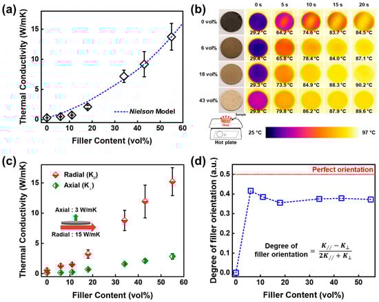 (a) The graph into the thermal conductivity of h-BN/PHT composites with varying loadings of h-BN fillers. A predictive model, based on the Nielsen model, is depicted as a dashed blue line in the same plot. (b) Thermal infrared images capture the heating process of the composites at 90 °C, with the filler volume fractions indicated in parentheses, and the corresponding temperature values are provided for each image. (c) The measured radial (K//) and axial (K⊥) thermal conductivities, along with their standard deviations, are presented to illustrate the anisotropy in thermal conductivity concerning h-BN loading. (d) Degree of filler orientation by calculated anisotropic thermal conductivity. The red dotted line serves as a reference for perfect h-BN orientation in the radial direction of the composite. Reproduced from Ref. []. Copyright 2023, Elsevier.