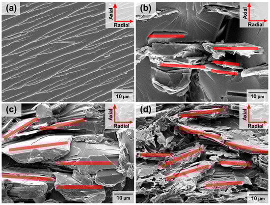 Displayed are representative field emission scanning electron microscope (FE-SEM) images captured from fractured h-BN/PHT composites. The red lines represent an aligned h-BN in the radial direction. The composites exhibit different h-BN volume fractions: (a) 0, (b) 6, (c) 12, and (d) 55 vol%. Reproduced from Ref. []. Copyright 2023, Elsevier.