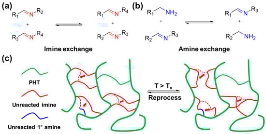 From the research literature, findings unveil the presence of unreacted imines and primary amines []. This discovery implies the potential of PHT to exhibit vitrimer behavior through two dynamic bond exchange reactions. The first involves imine metathesis, occurring between imines, while the second is transamination, which encompasses the exchange between amines and imines, as illustrated in the respective reactions, as shown in Figure 7. Above the temperature of Tv, dynamic exchange reactions occur, making reprocessing possible.