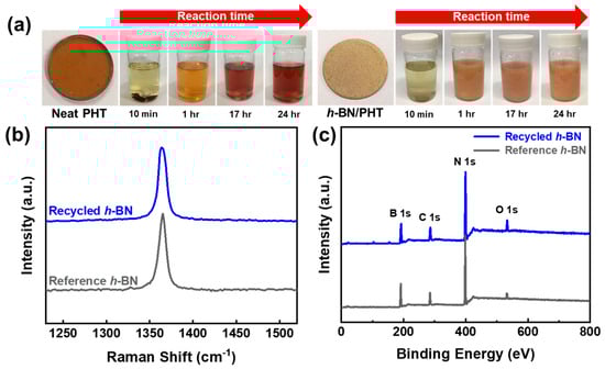 The PHT matrix was employed to reclaim h-BN from composite materials through the chemical breakdown of PHT in low pH conditions (≤2) [,]. After soaking PHT in an acidic solution for more than 24 h, the absence of any solid residue affirmed the complete chemical breakdown (Figure 9a). Breaking down composite materials in an acidic solution resulted in a translucent pink mixture, from which the h-BN filler, surpassing 99% in weight, easily separated after multiple washes and vacuum drying. Assessing the recovered h-BN’s quality involved comparing values from Raman spectra (14.9 cm−1 and 15.0 cm−1), indicating a sustained quality (Figure 9b). This was corroborated by XPS results, revealing similarities in the elemental composition (Figure 9c). Furthermore, PHT withstood dissolution in common organic solvents even after prolonged soaking, demonstrating a resilient resistance, with decomposition only occurring under acidic conditions. In conclusion, the nanocomposite for heat dissipation, leveraging the characteristics of the vitrimer PHT, stands as an advanced vitrimer with facile reprocessability and recyclability.