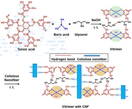 To create a vitrimer with a high crosslink density, tannic acid, boron acid, and glycerol are utilized under base conditions (OH− generated by a NaOH solution) to form borate ions []. Subsequently, a vitrimer incorporating boronic ester bonds is generated. During the optimization process (Table 1), a vitrimer with an increased crosslink density is formed to enhance the thermal pathway and reduce phonon scattering during manufacturing. In addition to enhancing the thermal pathway, the nanocomposite, glycerol, and cellulose nanofibers (CNFs) are mixed to enable intermolecular hydrogen bonding. CNFs, a nano-scale filler commonly used to enhance composite properties [], are included in the system. A new system is prepared by adding CNF, aiming to create a constant structure of CNFs with abundant hydroxyl groups, facilitating the formation of hydrogen bonds with both boric acid and tannic acid (refer to Figure 10).