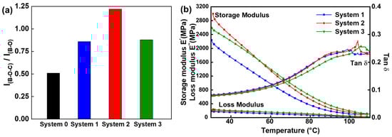 (a) The intensity ratio of FT-IR peaks from B-O-C to B-O for composites in systems 0–3. (b) Dynamic mechanical analysis plots for composites in systems 1, 2, and 3. Reproduced from Ref. []. Copyright 2023, Elsevier.