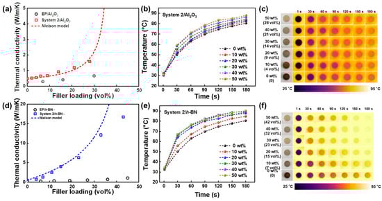 A graph of experimental and theoretical thermal conductivity of (a) system 2/Al2O3. An increase in the surface temperatures of system 2/Al2O3 composites over time during heating, along with (b) corresponding infrared thermal depictions for the composites incorporating different Al2O3 concentrations. (c) Variations in the surface temperatures of system 2/h-BN composites during heating. Measured results in the same sequence corresponding to System 2/h-BN composites (d–f). Reproduced from Ref. []. Copyright 2023, Elsevier.