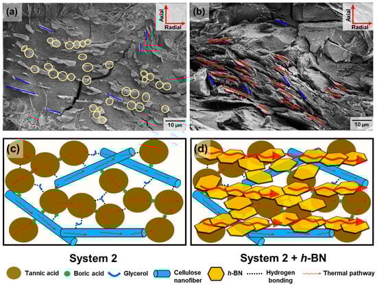 Cross-sectional FE-SEM images of (a) system 2 Al2O3 and (b) h-BN. The yellow circles represent Al2O3, the blue lines represent CNF, and the red lines represent h-BN. Mechanism of thermal passway established by the crosslinking networks involving hydrogen bonds and boronic ester bonds in composites of (c) system 2 and (d) the composites subsequent to the incorporation of the h-BN filler into system 2. Reproduced from Ref. []. Copyright 2023, Elsevier.
