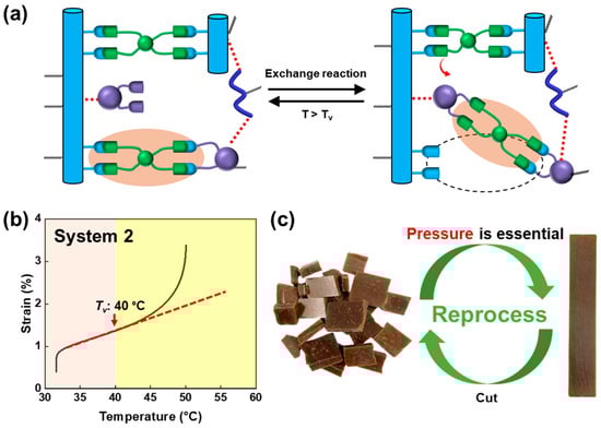 (a) Schematic representation of the network rearrangement process through a boronic exchange reaction. (b) The topological freezing transition temperatures (Tv) for system 2, as determined through the creep test. (c) Reprocessing capability of system 2 utilizing a heating press. Reproduced from Ref. []. Copyright 2023, Elsevier.
