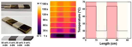 In Figure 15, the advantage of reformation is solely utilized through the thermal pressure molding of a composite grating, formed by connecting four segments—system 2 and system 2/h-BN (50 wt%) repeatedly—using the reversible properties of the boronic ester bonds under heat-press conditions. Placed on a heating plate at 90 °C, it showcases the surface temperature change along the sample’s longitudinal direction, affirming the successful creation of a four-segment composite grating with varying thermal conductivities. In conclusion, utilizing the advantages of heat-pressure reprocessing allows for the easy creation of a grating structure. This enables efficient heat transfer only in the desired areas, facilitating effective reprocessing.