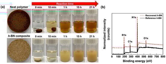 (a) The specimens were dissolved by immersion. Top row, the pristine matrix; bottom row, the h-BN composite. (b) XPS spectra of the recovered and reference h-BN filler samples. The peaks were normalized using the maximum N1s peak intensity of each scan. Reproduced from Ref. []. Copyright 2023, Elsevier.