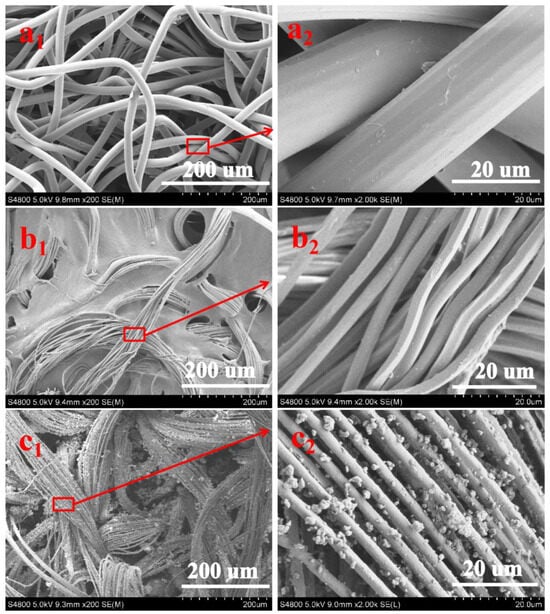The SEM images of NWF, PNWF and SIS/PNWF-10% substrates are illustrated in Figure 2, respectively. For the NWF, it reveals that the average diameter of the single sea–island fiber is about 20 μm (Figure 2(a1,a2)). Figure 2(b1,b2) indicates that the individual island fiber is separated into many microfibers with a diameter of approximately 2–3 µm, which is clearly lower than that of the single sea–island fiber for the NWF. Further observation reveals that there are plentiful voids in the PNWF substrate, which can favor increasing the specific surface area of the substrates. As depicted in Figure 2(c1,c2), SIS microspheres are densely distributed on the surface of PNWF substrates. These results show that SIS/PNWF substrates were successfully fabricated.