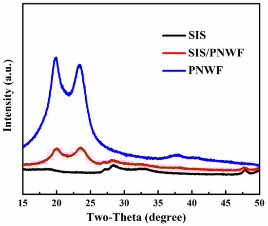 The XRD patterns of SIS, SIS/PNWF-10%, and PNWF substrates.