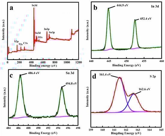 XPS was employed to investigate the element’s composition and the chemical state of the SIS/PNWF-10% substrate. A survey spectrum clearly shows that the Sn, In, and S elements existed in the SIS/PNWF substrate (Figure 4a). The intense peaks located at 444.9 eV and 452.4 eV (Figure 4b) are attributed to In 3d5/2 and In 3d3/2 of In3+, respectively. As exhibited in Figure 4c, the obvious peaks of 486.4 eV and 494.8 eV can be assigned to the Sn 3d5/2 and Sn 3d3/2, respectively. This result demonstrates that Sn4+ exists in the SIS/PNWF substrate. As for the S 2p spectrum (Figure 4d), two apparent peaks at 161.4 eV and 162.6 eV can be assigned to the S 2p1/2 and S 2p3/2 of S2−, respectively. In other words, the above results further confirm the formation of SIS/PNWF substrates.