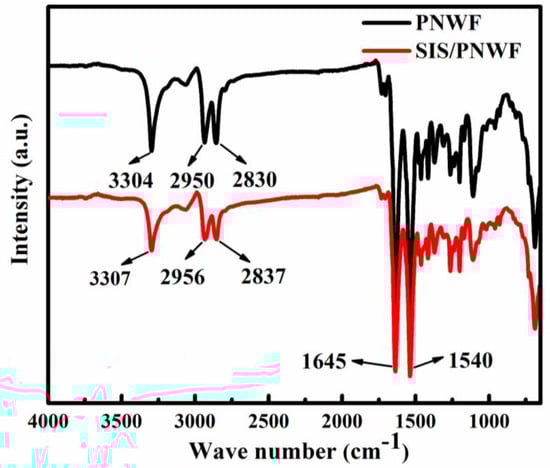 ATR-FTIR spectroscopy was applied to survey the surface chemical structure change in PNWF and SIS/PNWF-10% substrates. As illustrated in Figure 6, the characteristic peaks are at 3304, 1645, and 1540 cm−1, which is consistent with υN–H, υC=O and the combining absorption of both δN–H and υC–N, respectively. The prominent peaks at 2950 and 2830 cm−1 correspond to the C–H stretching vibration for -CH3. Further observation reveals that the spectrum of the PNWF is akin to that of the SIS/PNWF substrate. Therefore, the FT-IR spectrum indicates that the structure of the PNWF is not affected by the incorporation procedure of SIS.