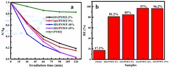 The photocatalytic activity for RhB over a series of SIS/PNWF substrates was estimated under visible light. Compared with the PNWF, the SIS/PNWF substrates show enhanced photocatalytic performance (Figure 8). Just as was predicted, the photocatalytic activity of the SIS/PNWF substrates is clearly affected by the SIS content. It is clear that the RhB degradation rate gradually rises from 81.2% to 97% when the SIS photocatalysts content increases from 2% to 10%, whereas the degradation efficiency of RhB descends when the dosage ratio of SIS photocatalysts further increases to 15%. It can be inferred that an excess of photocatalysts could increase light scattering and bring down the absorbance, resulting in a decline in the degradation rate of the contaminants [51]. Therefore, the photocatalytic activity of a series of as-prepared SIS/PNWF substrates first increased and then reduced with an increase in the SIS content, indicating that the optimized weight ratio of SIS to PNWF was 10%. The enhanced photocatalytic activity of the SIS/PNWF-10% substrate should be attributed to the successful loading of SIS, the strong light absorption, and the inherent hierarchical porous structure of the PNWF substrate.