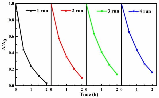 Generally, the reusability and stability of photocatalysts are key factors affecting their practical application. In this work, the reusability and stability of SIS/PNWF substrates were studied. After each photocatalytic reaction, the SIS/PNWF substrate was pulled out from the reaction system by a nipper, then washed with DI water several times and dried at 60 °C for 8 h. As shown in Figure 9, the removal rate of RhB can reach up to 97% within 2 h under a visible light irradiation. After running four cycles, the degradation rate of RhB can still maintain 84%. The results indicate that SIS/PNWF substrates have good recyclability and stability. A slight decrease in the photocatalytic activity of the recovered SIS/PNWF substrates may be explained by the fact that a small amount of SIS photocatalyst could be lost in the process of consecutive recycling experiments.