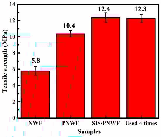 Mechanical performance is the key factor affecting the stability of the materials [52]. The tensile strength of the NWF, PNWF, SIS/PNWF-10%, and SIS/PNWF-10% (used four times) substrates was evaluated by an electronic universal testing machine with the tensile speed of 100 mm·min−1 at room temperature. As depicted in Figure 10, the tensile strength of the PNWF substrate with the value of 10 MPa is greater than that of the NWF substrate, which indicates that polyurethane is beneficial for improving the tensile strength of the PNWF substrate. Interestingly, after depositing SIS photocatalysts on the PNWF substrate, the SIS/PNWF-10% substrate showed enhanced tensile strength with a value of 12.4 MPa. This result can be interpreted as indicating that SIS photocatalysts are conducive to enhancing the tensile strength of the PNWF substrate. Moreover, after running four cycles, the SIS/PNWF-10% substrate still maintains excellent tensile strength with the value of 12.3 MPa. Thus, these results indicate that the SIS/PNWF-10% substrate possesses superior tensile strength.