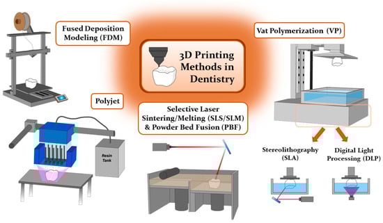 Different 3D printing techniques in dentistry. Adapted from [,,,].