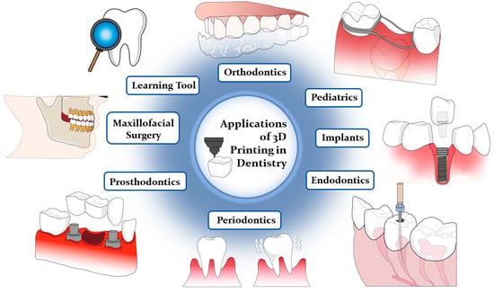 Applications of 3D printing in dentistry. Adapted from [,,].