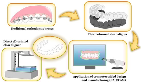 The historical evolution of aligner technology can be traced back to Dr. Harold D. Kesling’s groundbreaking work in 1945, where he pioneered the use of plastic-based tooth aligners for addressing minor malocclusions. Kesling not only laid the foundation for this approach but also provided insights into its limitations and future potential [,,]. Building upon Kesling’s work, Henry Nahoum made significant contributions in 1964 by introducing vacuum-formed thermoplastics and auxiliary components, enhancing the precision and effectiveness of corrective forces [,,,]. In 1971, Robert Ponitz emphasized the use of transparent materials and incremental staged movements, further advancing orthodontic alignment techniques []. A pivotal moment in modernizing aligner technology occurred in 1997 when Zia Chishti and Kelsey Wirth introduced the CAD/CAM-based Invisalign™ system, which has since undergone multiple iterations to optimize its efficacy [,,,]. Presently, the integration of 3D printing technologies in aligner fabrication has sparked a revolution in customization and production efficiency, as demonstrated in Figure 3.