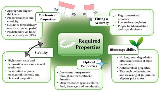 The successful formulation of treatment plans involving clear aligner therapy necessitates a thorough evaluation of the diagnosis and the thoughtful selection of key aligner features, such as their mechanical properties, thickness, and activation level []. To ensure the quality and safety of 3D-printed dental resins used in orthodontic devices, the necessary specifications for physical and mechanical properties are outlined in ISO 20795-2 [,]. Apart from the mechanical characteristics, other crucial aspects that demand careful consideration include fitting precision, accuracy, stability in intraoral environments, optical appearance, and biocompatibility of the 3D-printed aligners, as concisely summarized in Figure 4.