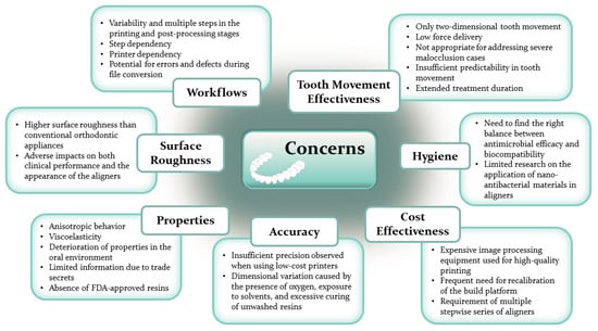 Even though clear aligners offer advantages in simplicity, comfort, and removability, preserving esthetics and supporting oral hygiene, they still face several challenges, including treatment time, accuracy, attachability, cost, accessibility, and biocompatibility [,,,,]. Treatment duration depends on patient compliance, and challenges can arise with lower premolars having a round morphology []. Clinical studies have revealed varying levels of treatment accuracy, indicating the need for further research []. Prediction models have shown approximately 78% accuracy in aligner therapy outcomes [,]. Some thermoplastic polymers used in aligners can exhibit cytotoxic effects due to monomer release during thermoforming [,]. Additionally, conventional aligner manufacturing limits appliance changes during treatment []. Researchers have observed material degradation related to temperature changes and water absorption, influenced by polymer crystal structure [,,,,]. Temperature and long-term intra-oral use can affect surface morphology and mechanical properties [].