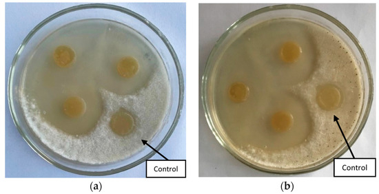 The antifungal activity was determined using the agar disk diffusion method. Bacteria were cultured for 48 h in nutrient broth at 28 °C with aeration. Bacterial cultures were spread on the surface of nutrient agar as a continuous lawn in a volume of 100 µL, and after 48 h of growth, 5 mm diameter disks were cut. Disks with bacterial culture were placed on Petri dishes previously inoculated with a continuous lawn of phytopathogenic test cultures (Fusarium solani, Fusarium oxysporum) at a concentration of 106 spores mL−1. A nutrient agar disk served as a control. The Petri dishes were incubated at 28 °C for 72 h. The antifungal activity was assessed by measuring the diameter of the growth inhibition zone of the tested phytopathogens [18].