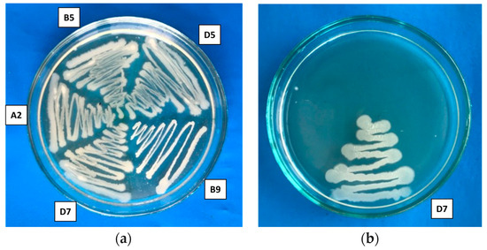 Growth of bacterial strains on medium containing (a) 5% NaCl and (b) 15% NaCl. D5—Pseudomonas flavescens D5, A2—Bacillus aerophillus A2, B5—Serratia proteamaculans B5, B9—Bacillus simplex B9, D7—Pseudomonas putida D7.