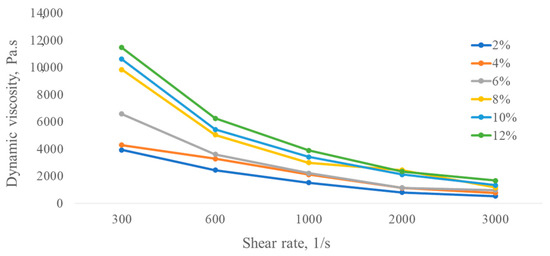 The dynamic viscosity of the polymer’s solution with different concentrations—2, 4, 6, 8, 10, and 12% w/v—was performed using a rotational Ametek Brookfield DVPlus viscometer with a ULA spindle, at different shear rates, ranging from 0.1 to 500 s−1 at 25 °C [23]. The viscosimetric analyses of the samples were performed at 25 °C.