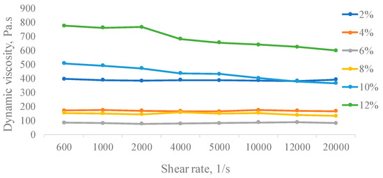 The dynamic viscosity of each concentration solution produced by B. thuringiensis C8 obviously decreased with the increase in shear rate (Figure 3), showing a shear-thinning behavior, which means that this kind of polysaccharide solution belongs to non-Newtonian fluid (or pseudoplastic flow behavior). Solutions of polymers in water and at the same concentrations can sometimes have oppositional behaviors, i.e., Newtonian or non-Newtonian fluids, depending on their structures, molecular weights, and polymer microbial producers [46,47].