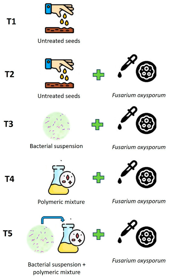 - T5—Simultaneous seed coating with bacterial suspension and polymeric mixture of Fusarium oxysporum.