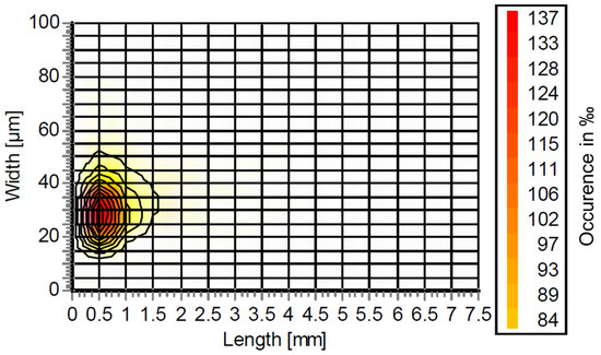 The results from the Fiber Tester are plotted in Figure 1. As can be seen, there are predominantly short fibers and fines with a length between 0 and 1.5 mm and a width between 10 and 50 µm. Here, the greatest abundance is at a length and width of 0.5 mm and 30 µm, respectively. Compared with previous results in CTMP or Kraft pulp [3,4], the long fiber fraction at >1.5 mm length is lacking. This is also mirrored by the data in Table 2 which compares the Kraft and organosolv fibers. Here, the mean fiber width is almost the same, whereas the mean fiber length is approximately four times larger for the Kraft pulp. Along with this smaller fiber size, the fines content of organosolv fibers is significantly higher at 82.3% as compared to 15.4% for Kraft. Compared with our previous publication, the dimensions of the organosolv fibers are closer to those of fibers with hydrolysis lignin, which were mechanically treated in a blender [4].